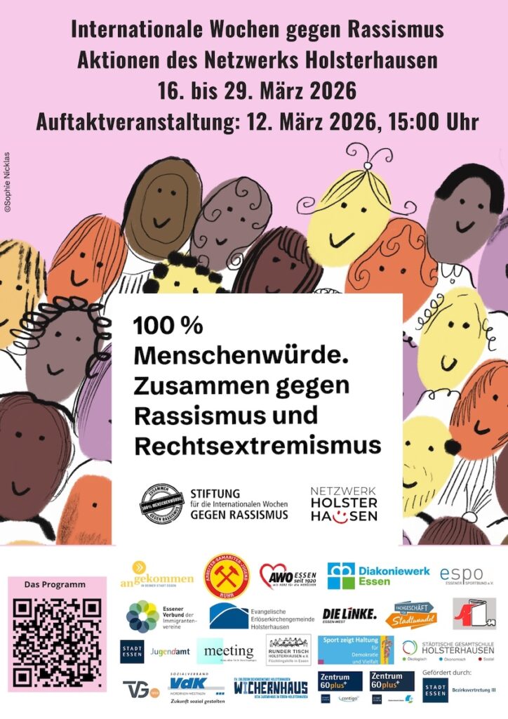 Wir laden alle Nachbar*innen, Initiativen, Familien, Freundeskreise und Engagierten herzlich zur Eröffnungsveranstaltung der Internationalen Wochen gegen Rassismus ein. Gemeinsam bilden wir eine Menschenkette, die zeigt: In Holsterhausen halten wir zusammen. Wir lassen uns nicht spalten – Vielfalt ist unsere Stärke.